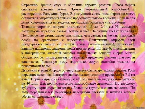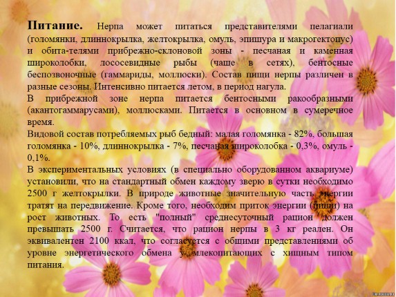 Питание. Нерпа может питаться представителями пелагиали (голомянки, длиннокрылка, желтокрылка, омуль, эпишура и макрогектопус) и обита-телями прибрежно-склоновой зоны - песчаная и каменная широколобки, лососевидные рыбы (чаще в сетях), бентосные беспозвоночные (гаммариды, моллюски). Состав пищи нерпы различен в разные сезоны. Интенсивно питается летом, в период нагула.