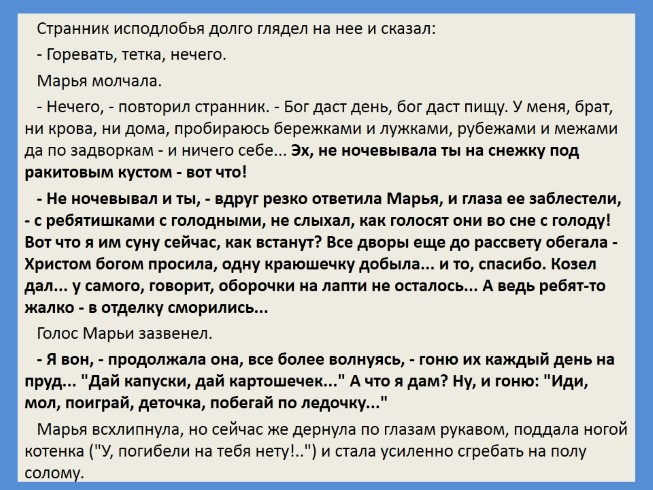 Этот эпизод спора Марьи со странником важен и для раскрытия духовного, эмоционального потенциала героев рассказа (позволяет Марье высказать свою боль, а Таньке понять боль матери, ее проблему и по-детски искать возможность помочь ей, что рождает решение бежать на улицу, пробыть там весь день до вечера и не просить есть), и для развития сюжета (замерзшую Таньку замечает барин).