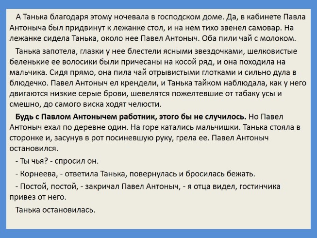 А Танька благодаря этому ночевала в господском доме. Да, в кабинете Павла Антоныча был придвинут к лежанке стол, и на нем тихо звенел самовар. На лежанке сидела Танька, около нее Павел Антоныч. Оба пили чай с молоком.