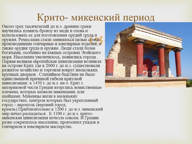 Около трех тысячелетий до н.э. древние греки научились плавить бронзу из меди и олова и использовать ее для изготовления орудий труда и оружия. Ремеслами стали заниматься целые семьи, производившие гончарные и ювелирные изделия, а также орудия труда и оружие. Люди стали более богатыми, особенно на южных островах Эгейского моря. Население увеличилось, появились города . Первая великая европейская цивилизация возникла на острове Крит, где к 2000 г. до н.э. существовали развитое хозяйство и торговля вокруг нескольких крупных дворцов . Стихийное бедствие не было единственной причиной гибели критской цивилизации: к 1450 г. до н.э. на о. Крит с материковой части Греции вторглись воинственные племена, которых назвали микенцами, или ахейцами. Микенцы жили в маленьких государствах, центром которых был укрепленный город – акрополь (верхний город, кремль).Приблизительно к 1200 г. до н.э. микенский мир начал распадаться . К 1100 г. до н.э. крито-микенская цивилизация исчезла совсем. В Греции резко сократилось население, произошел упадок в гончарном и ювелирном мастерстве.