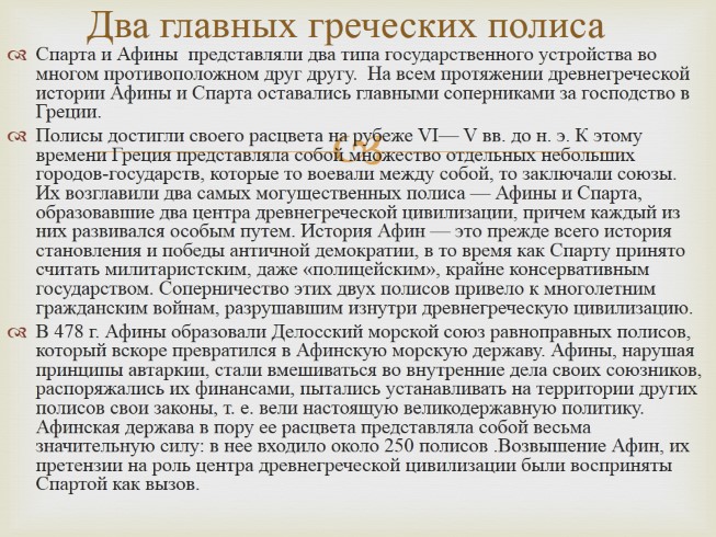 Спарта и Афины представляли два типа государственного устройства во многом противоположном друг другу. На всем протяжении древнегреческой истории Афины и Спарта оставались главными соперниками за господство в Греции.