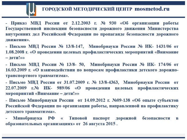 - Письмо МВД России № 13/8- 50, Минобрнауки России № ИК- 174/06 от 16.03.2009 г. «О взаимодействии по вопросам профилактики детского дорожно-транспортного травматизма».