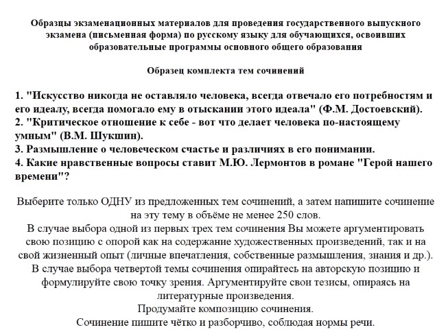 В экзаменационный комплект тем сочинений включаются четыре темы разной проблематики, сгруппированные в соответствии с определенной структурой, и прилагаются краткие инструкции для. Все темы раскрываются в жанре сочинения-рассуждения.
