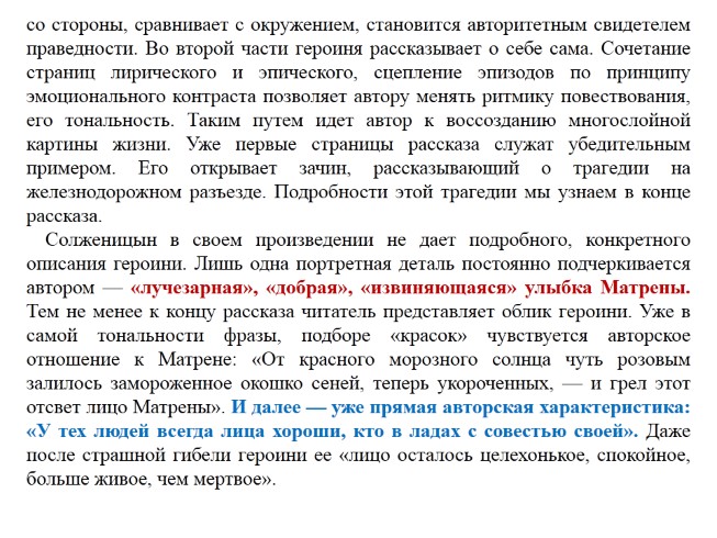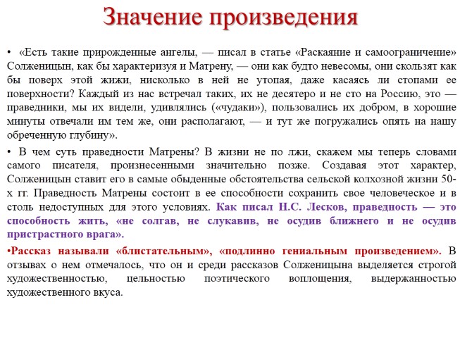 В чем суть праведности Матрены? В жизни не по лжи, скажем мы теперь словами самого писателя, произнесенными значительно позже. Создавая этот характер, Солженицын ставит его в самые обыденные обстоятельства сельской колхозной жизни 50-х гг. Праведность Матрены состоит в ее способности сохранить свое человеческое и в столь недоступных для этого условиях. Как писал Н.С. Лесков, праведность — это способность жить, «не солгав, не слукавив, не осудив ближнего и не осудив пристрастного врага».