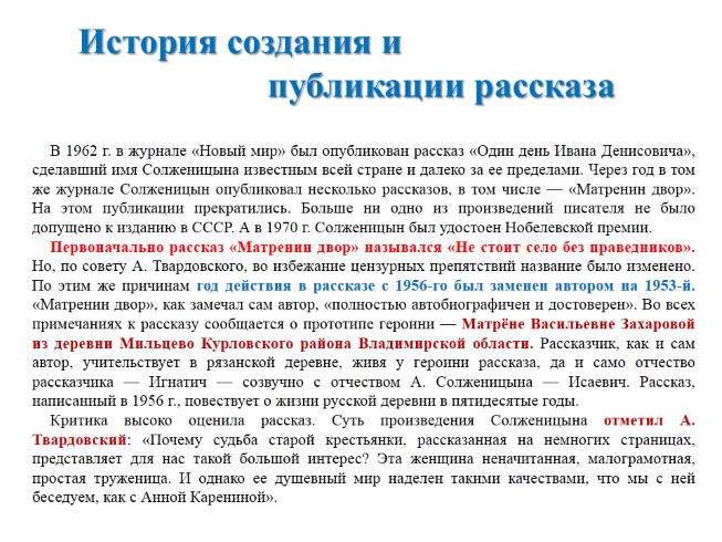 В 1962 г. в журнале «Новый мир» был опубликован рассказ «Один день Ивана Денисовича», сделавший имя Солженицына известным всей стране и далеко за ее пределами. Через год в том же журнале Солженицын опубликовал несколько рассказов, в том числе — «Матренин двор». На этом публикации прекратились. Больше ни одно из произведений писателя не было допущено к изданию в СССР. А в 1970 г. Солженицын был удостоен Нобелевской премии.