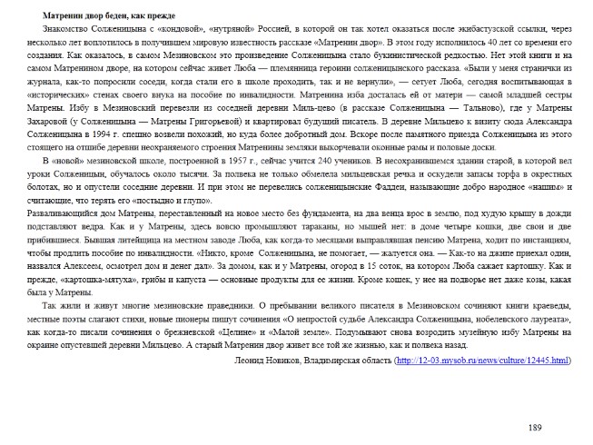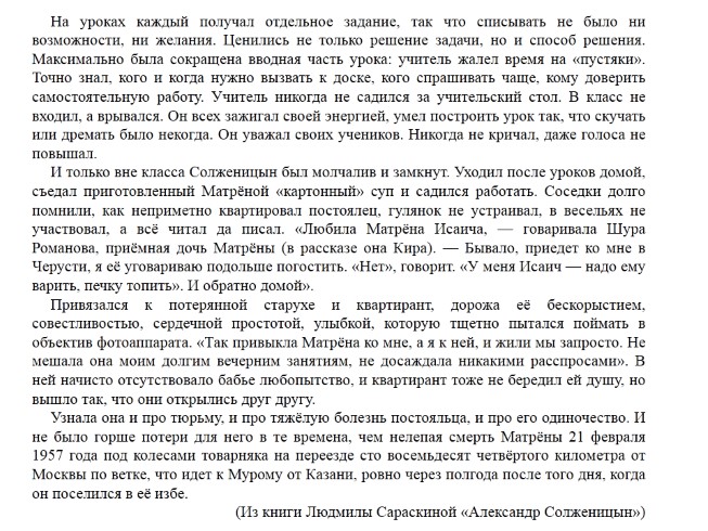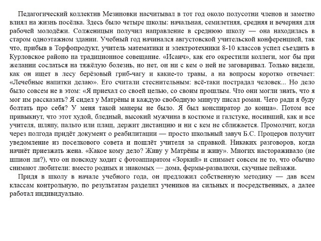И только вне класса Солженицын был молчалив и замкнут. Уходил после уроков домой, съедал приготовленный Матрёной «картонный» суп и садился работать. Соседки долго помнили, как неприметно квартировал постоялец, гулянок не устраивал, в весельях не участвовал, а всё читал да писал. «Любила Матрёна Исаича, — говаривала Шура Романова, приёмная дочь Матрёны (в рассказе она Кира). — Бывало, приедет ко мне в Черусти, я её уговариваю подольше погостить. «Нет», говорит. «У меня Исаич — надо ему варить, печку топить». И обратно домой».