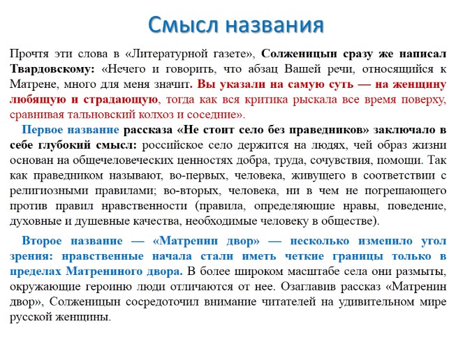 Второе название — «Матренин двор» — несколько изменило угол зрения: нравственные начала стали иметь четкие границы только в пределах Матрениного двора. В более широком масштабе села они размыты, окружающие героиню люди отличаются от нее. Озаглавив рассказ «Матренин двор», Солженицын сосредоточил внимание читателей на удивительном мире русской женщины.