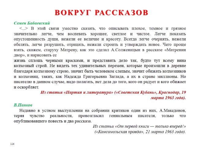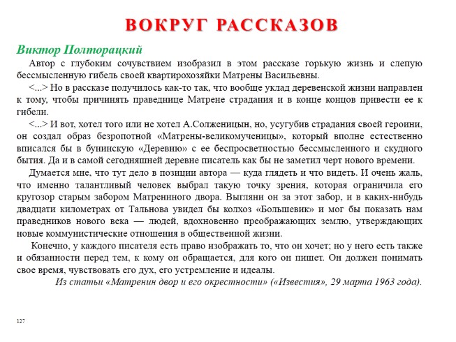<...> И вот, хотел того или не хотел А.Солженицын, но, усугубив страдания своей героини, он создал образ безропотной «Матрены-великомученицы», который вполне естественно вписался бы в бунинскую «Деревню» с ее беспросветностью бессмысленного и скудного бытия. Да и в самой сегодняшней деревне писатель как бы не заметил черт нового времени.