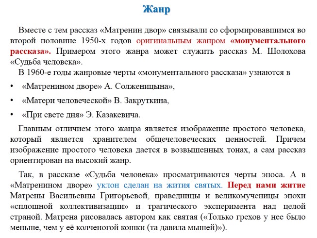 Так, в рассказе «Судьба человека» просматриваются черты эпоса. А в «Матренином дворе» уклон сделан на жития святых. Перед нами житие Матрены Васильевны Григорьевой, праведницы и великомученицы эпохи «сплошной коллективизации» и трагического эксперимента над целой страной. Матрена рисовалась автором как святая («Только грехов у нее было меньше, чем у её колченогой кошки (та давила мышей)»).