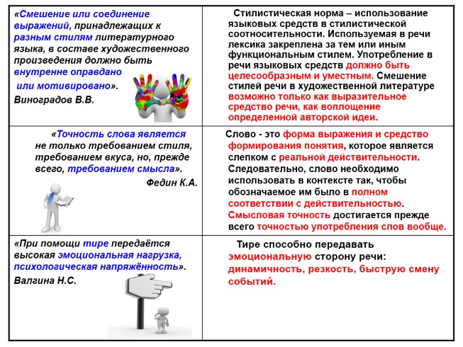 Виноградов В.В. Стилистическая норма – использование языковых средств в стилистической соотносительности. Используемая в речи лексика закреплена за тем или иным функциональным стилем. Употребление в речи языковых средств должно быть целесообразным и уместным. Смешение стилей речи в художественной литературе возможно только как выразительное средство речи, как воплощение определенной авторской идеи.