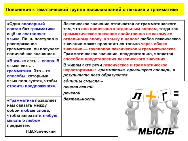 Пояснения к тематической группе высказываний о лексике и грамматике
