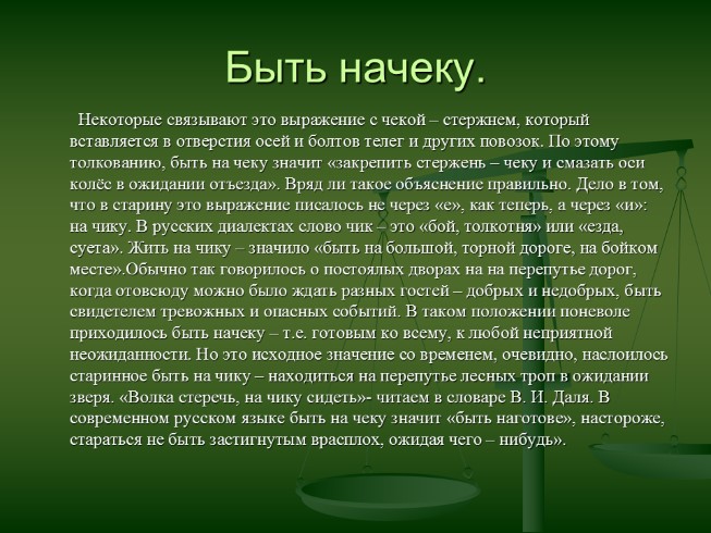 Некоторые связывают это выражение с чекой – стержнем, который вставляется в отверстия осей и болтов телег и других повозок. По этому толкованию, быть на чеку значит «закрепить стержень – чеку и смазать оси колёс в ожидании отъезда». Вряд ли такое объяснение правильно. Дело в том, что в старину это выражение писалось не через «е», как теперь, а через «и»: на чику. В русских диалектах слово чик – это «бой, толкотня» или «езда, суета». Жить на чику – значило «быть на большой, торной дороге, на бойком месте».Обычно так говорилось о постоялых дворах на на перепутье дорог, когда отовсюду можно было ждать разных гостей – добрых и недобрых, быть свидетелем тревожных и опасных событий. В таком положении поневоле приходилось быть начеку – т.е. готовым ко всему, к любой неприятной неожиданности. Но это исходное значение со временем, очевидно, наслоилось старинное быть на чику – находиться на перепутье лесных троп в ожидании зверя. «Волка стеречь, на чику сидеть»- читаем в словаре В. И. Даля. В современном русском языке быть на чеку значит «быть наготове», настороже, стараться не быть застигнутым врасплох, ожидая чего – нибудь».
