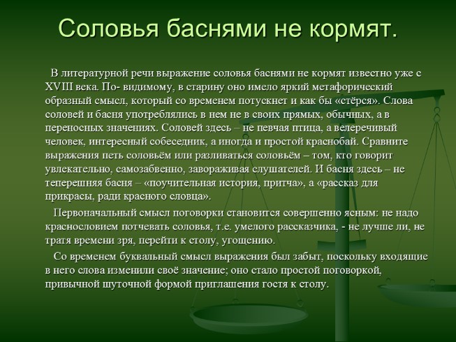 В литературной речи выражение соловья баснями не кормят известно уже с XVIII века. По- видимому, в старину оно имело яркий метафорический образный смысл, который со временем потускнет и как бы «стёрся». Слова соловей и басня употреблялись в нем не в своих прямых, обычных, а в переносных значениях. Соловей здесь – не певчая птица, а велеречивый человек, интересный собеседник, а иногда и простой краснобай. Сравните выражения петь соловьём или разливаться соловьём – том, кто говорит увлекательно, самозабвенно, завораживая слушателей. И басня здесь – не теперешняя басня – «поучительная история, притча», а «рассказ для прикрасы, ради красного словца».
