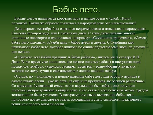 Отсюда, по – видимому, и пошло название бабье лето для особого периода в самом начале осени – уже не лета, на ещё и не предзимья, не осенней распутицы. Со временем буквальный смысл этого выражения был забыт, оно получило широкое распространение в общей речи, и его связь с крестьянским бытом, трудом землепашцев была утрачена. В литературном языке выражение бабье лето приобрело новые смысловые связи, ассоциации и стало символом предзимнего тепля или просто золотой осени.