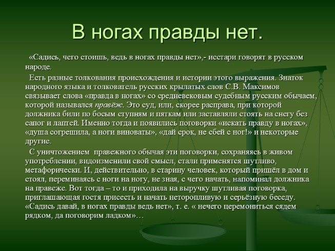 С уничтожением правежного обычая эти поговорки, сохраняясь в живом употреблении, видоизменили свой смысл, стали применятся шутливо, метафорически. И, действительно, в старину человек, который пришёл в дом и стоял, переминаясь с ноги на ногу, не зная, с чего начать, напоминал должника на правеже. Вот тогда – то и приходила на выручку шутливая поговорка, приглашающая гостя присесть и начать неторопливую и серьёзную беседу. «Садись давай, в ногах правды ведь нет», т. е. « нечего церемониться сядем рядком, да поговорим ладком»…