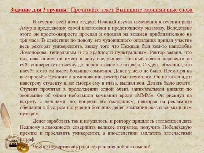 Задание для 3 группы: Прочитайте текст. Выпишите омонимичные слова.