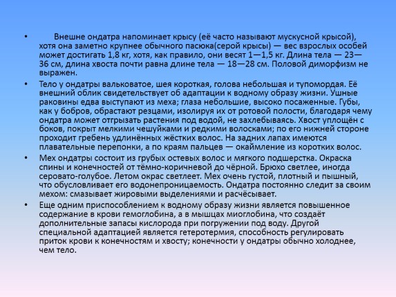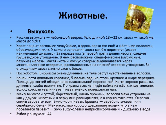 Русская выхухоль — небольшой зверек. Тело длиной 18—22 см, хвост — такой же, масса до 520 г.