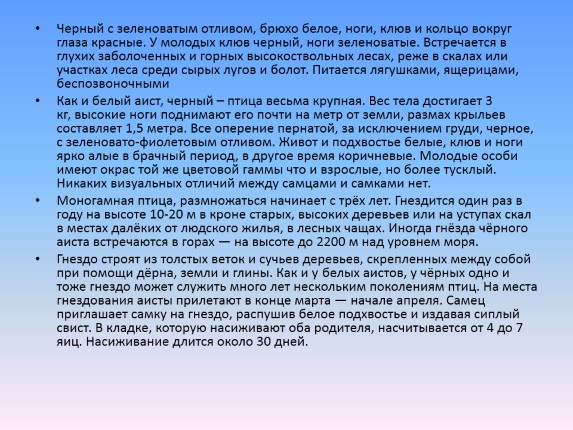 Как и белый аист, черный – птица весьма крупная. Вес тела достигает 3 кг, высокие ноги поднимают его почти на метр от земли, размах крыльев составляет 1,5 метра. Все оперение пернатой, за исключением груди, черное, с зеленовато-фиолетовым отливом. Живот и подхвостье белые, клюв и ноги ярко алые в брачный период, в другое время коричневые. Молодые особи имеют окрас той же цветовой гаммы что и взрослые, но более тусклый. Никаких визуальных отличий между самцами и самками нет.