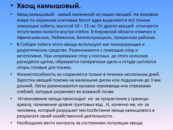 Хвощ камышовый - самый маленький из наших хвощей. На моховом ковре по окраинам ключевых болот едва выделяются его тонкие зимующие побеги, высотой 10 – 15 см. От других хвощей отличается отсутствием полости внутри стебля. В Кировской области отмечен в Афанасьевском, Лебяжском, Белохолуницком, Уржумском районах.