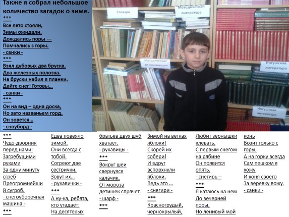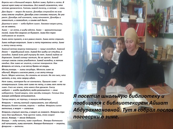 Я посетил школьную библиотеку и пообщался с библиотекарем Айшат Абдурахмановной. Тут я собрал пословицы и поговорки о зиме.