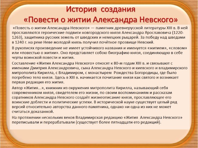 «Повесть о житии Александра Невского» — памятник древнерусской литературы XIII в. В ней прославляются героические подвиги новгородского князя Александра Ярославовича (1220-1263), защитника русских земель от шведских и немецких рыцарей. За победу над шведами в 1240 г. на реке Неве молодой князь получил почётное прозвище Невский.
