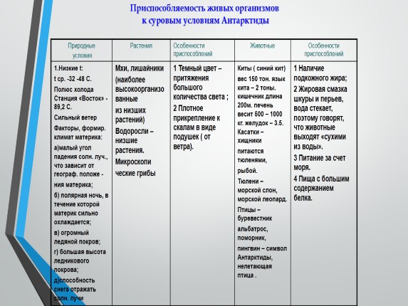 Заполните таблицу «Приспособляемость живых организмов к суровым условиям Антарктиды».