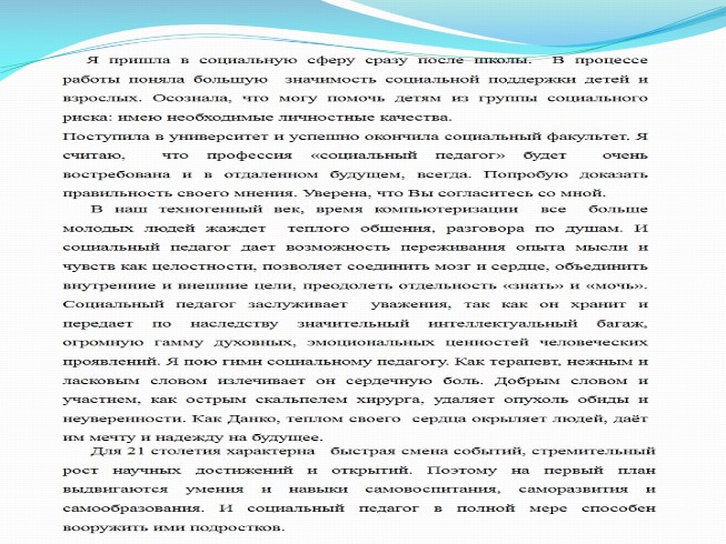 Социальная педагогика – особая страна. Хочу быть искренней, искренней с собой, с другими, с близкими или далекими. Хочу быть отзывчивой, чтобы не пройти рядом с чужой болью. Это главное достоинство профессии «социального педагога» и в необозримом будущем. Я рвусь туда и призываю идти за мной, чтобы научить ребенка иметь собственное мнение; воспитывать у детей самостоятельность, любознательность, честность, личную инициативу, веру в себя; стать им другом, раскрыть богатство их душ.