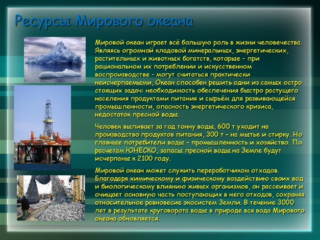 Главным богатством мирового океана, бесспорно, являются его огромные природные ресурсы.