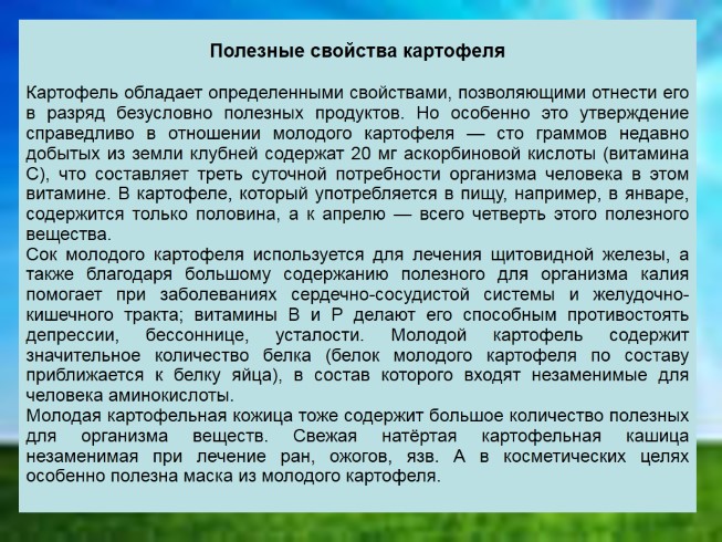 Картофель обладает определенными свойствами, позволяющими отнести его в разряд безусловно полезных продуктов. Но особенно это утверждение справедливо в отношении молодого картофеля — сто граммов недавно добытых из земли клубней содержат 20 мг аскорбиновой кислоты (витамина С), что составляет треть суточной потребности организма человека в этом витамине. В картофеле, который употребляется в пищу, например, в январе, содержится только половина, а к апрелю — всего четверть этого полезного вещества.