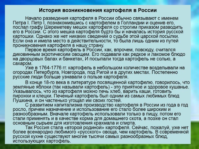 Начало разведения картофеля в России обычно связывают с именем Петра I. Петр I, познакомившись с картофелем в Голландии и оценив его, послал графу Шереметеву мешок картофеля со строгим приказом разводить его в России. С этого мешка картофеля будто бы и началась история русской картошки. Однако же нет никаких сведений о судьбе этой царской посылки. Если она и имела место в действительности, то была лишь одним из путей проникновения картофеля в нашу страну. Первое время картофель в России, как, впрочем, повсюду, считался диковинным экзотическим овощем. Его подавали как редкое и лакомое блюдо на дворцовых балах и банкетах, И посыпали тогда картофель не солью, а сахаром. Уже в 1764-1776 гг. картофель в небольшом количестве возделывали на огородах Петербурга, Новгорода, под Ригой и в других местах. Постепенно русские люди больше узнавали о пользе картофеля.