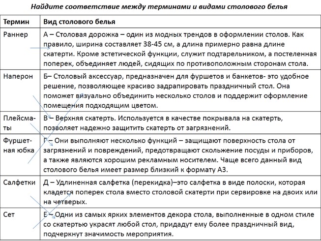 Найдите соответствие между терминами и видами столового белья
