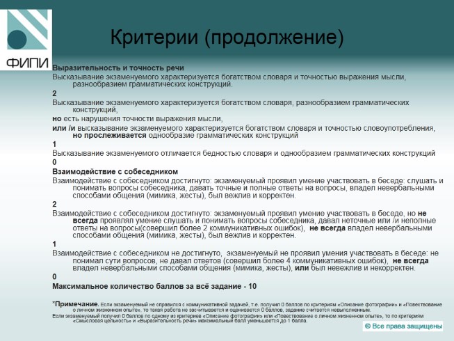 Если экзаменуемый получил 0 баллов по одному из критериев «Описание фотографии» или «Повествование о личном жизненном опыте», то по критериям «Смысловая цельность» и «Выразительность речи» максимальный балл уменьшается до 1 балла.