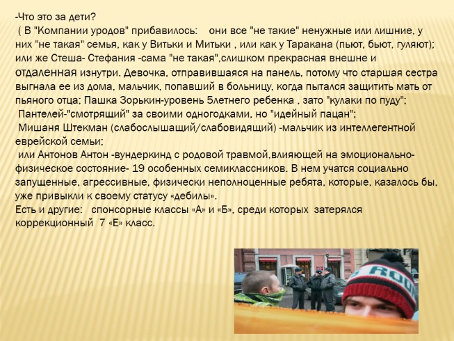 (Этот класс труден, даже очень. Ни один учитель подолгу не задерживается в нем. («Наша школа — огромная, — повествует Антон, — в ней триста учителей и полторы тысячи учеников. <…>)Первые два класса в каждой параллели — «А» и «Б» — гимназические. У них лучшие учителя, три иностранных языка, а кроме того, им преподают всякие важные и нужные предметы, вроде риторики и истории искусства. «Ашки» покруче, чем «бэшки», там больше зубрилок и детей спонсоров. Классы «В» и «Г» — нормальные. Там учатся те, у кого всё более-менее тип-топ и в голове, и в семьях. <…> Мы — класс «Е». Можете себе представить. И это при том, что всех откровенных дебилов нашего района сливают в 371-ю школу. Там — классы по 10 человек и особые программы. Выхода оттуда нет никакого — только на улицу или в интернат для хроников. Впрочем, у нашего класса коррекции перспективы тоже далеко не блестящие».)