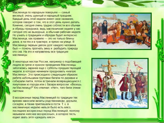 Масленица по народным поверьям — самый веселый, очень шумный и народный праздник. Каждый день этой недели имеет свое название, которое говорит о том, что в этот день нужно делать. Конечно, сегодня очень трудно соблюсти все обычаи и обряды праздника, ведь масленичная неделя у нас сегодня это не выходные, а обычная рабочая неделя. Но узнать о традициях и обрядах будет интересно. Масленица, как правило — это не только блины дома, в гостях и в трактире, и прямо на улице. В Масленицу первым делом долг каждого человека был — помочь прогнать зиму и разбудить природу ото сна. На это и направлены все традиции масленицы.