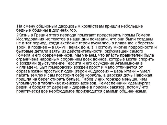 Жизнь в Греции этого периода помогают представить поэмы Гомера. Исследования их текстов в наши дни показали, что они были созданы не в тот период, когда ахейские герои пускались в плавание к берегам Трои, а позднее – в IX–VIII веках до н. э. Поэтому многие подробности и бытовые детали взяты из действительности, окружавшей самого Гомера и его современников. Мы узнаем, что власть правителей была ограничена народным собранием всех воинов, которые могли спорить с вождями (выступление Терсита и его осуждение Агамемнона в «Илиаде»). Быт гомеровских вождей прост и мало отличается от образа жизни простых людей (герой «Одиссеи» – царь Итаки – умел пахать землю и сам построил себе корабль, а царская дочь Навсикая пришла на берег стирать белье). Рабов у них гораздо меньше, чем упомянуто в табличках ахейских архивов. Ремесленники «демиурги» редки и бродят от деревни к деревне в поисках заказов, потому что практически все необходимое производится самими общинниками.