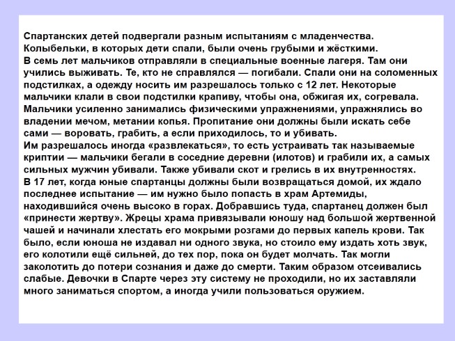 Спартанских детей подвергали разным испытаниям с младенчества. Колыбельки, в которых дети спали, были очень грубыми и жёсткими.