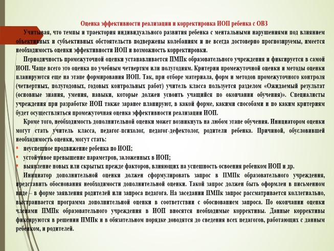 Учитывая, что темпы и траектория индивидуального развития ребенка с ментальными нарушениями под влиянием объективных и субъективных обстоятельств подвержены колебаниям и не всегда достоверно прогнозируемы, имеется необходимость оценки эффективности ИОП и возможность корректировки.