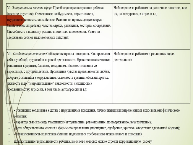 VII. Особенности личности Соблюдение правил поведения. Как проявляет себя в учебной, трудовой и игровой деятельности. Нравственные качества: отношение к родным, близким, товарищам. Взаимоотношения со взрослыми, с другими детьми. Проявления чувства привязанности, любви, доброго отношения к окружающим; склонность вредить, обижать других, лживость и др. "Разрушительные" наклонности, склонность к бродяжничеству, агрессии, в том числе аутоагрессии и т.п. Наблюдение за ребенком в различных видах деятельности