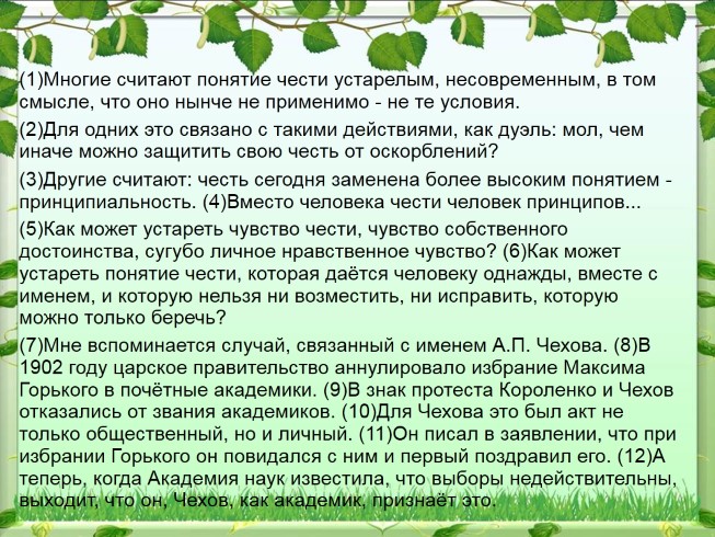 Автор убеждён в том, что понятие чести не может устареть и не может быть заменено никаким другим понятием. Как аргумент, подтверждающий его позицию, он приводит эпизод из биографии А.П. Чехова. Отстаивая честь своего друга, Максима Горького, которого Академия наук несправедливо, по мнению Антона Павловича, лишила только что выданного звания почётного академика, он сложил с себя собственное звание. Он мог бы этого и не делать, но примирить свою совесть с таким противоречием он не мог.