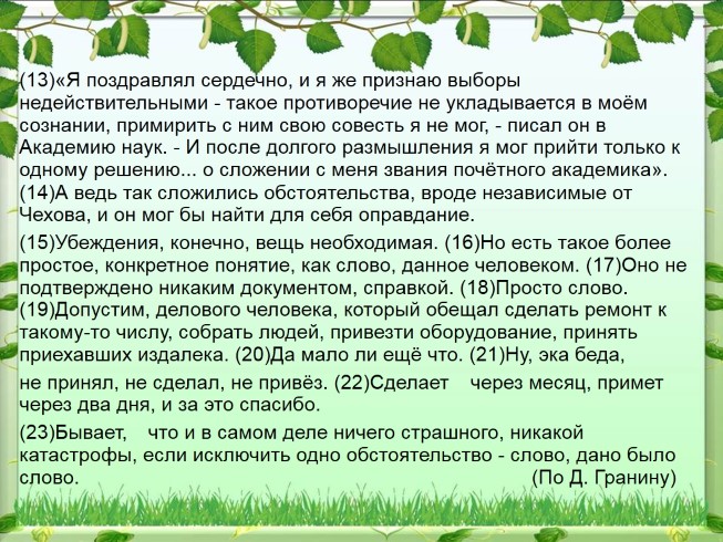 Может ли устареть понятие чести? Важно ли всегда исполнять данное слово, обещание? Над такими вопросами задумывается Д.А. Гранин в своем тексте.