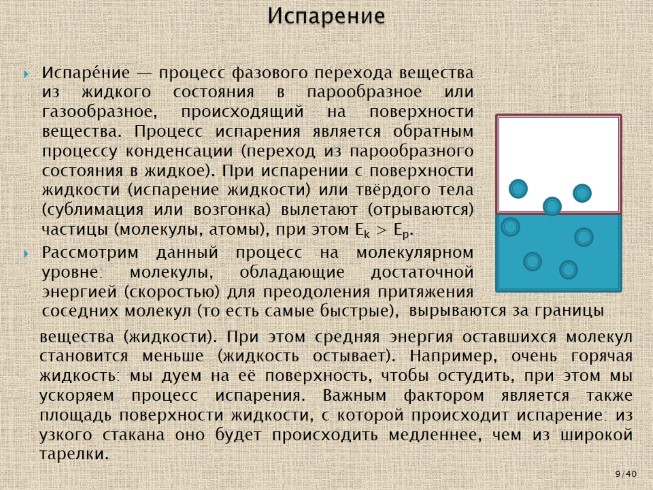 вещества (жидкости). При этом средняя энергия оставшихся молекул становится меньше (жидкость остывает). Например, очень горячая жидкость: мы дуем на её поверхность, чтобы остудить, при этом мы ускоряем процесс испарения. Важным фактором является также площадь поверхности жидкости, с которой происходит испарение: из узкого стакана оно будет происходить медленнее, чем из широкой тарелки.