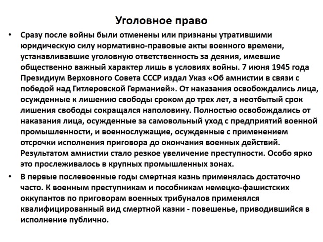 Сразу после войны были отменены или признаны утратившими юридическую силу нормативно-правовые акты военного времени, устанавливавшие уголовную ответственность за деяния, имевшие общественно важный характер лишь в условиях войны. 7 июня 1945 года Президиум Верховного Совета СССР издал Указ «Об амнистии в связи с победой над Гитлеровской Германией». От наказания освобождались лица, осужденные к лишению свободы сроком до трех лет, а неотбытый срок лишения свободы сокращался наполовину. Полностью освобождались от наказания лица, осужденные за самовольный уход с предприятий военной промышленности, и военнослужащие, осужденные с применением отсрочки исполнения приговора до окончания военных действий. Результатом амнистии стало резкое увеличение преступности. Особо ярко это прослеживалось в крупных промышленных зонах.