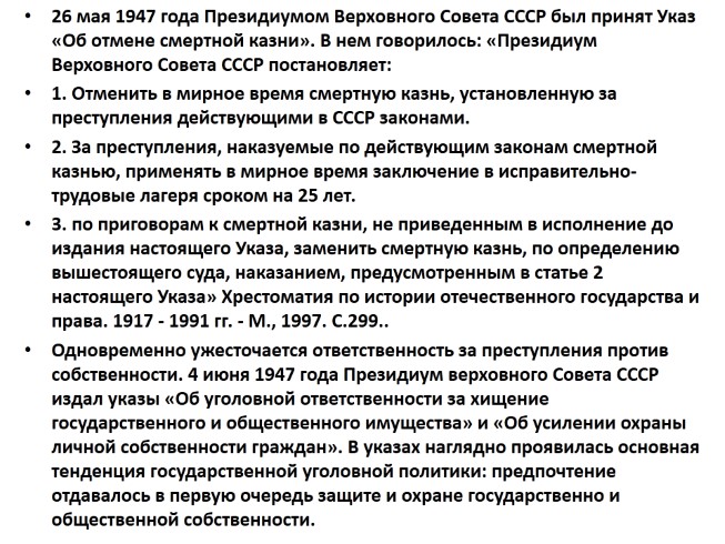 26 мая 1947 года Президиумом Верховного Совета СССР был принят Указ «Об отмене смертной казни». В нем говорилось: «Президиум Верховного Совета СССР постановляет: