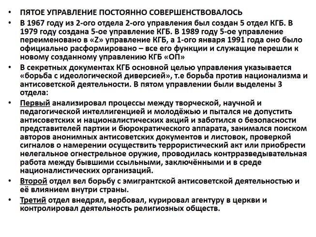 В 1967 году из 2-ого отдела 2-ого управления был создан 5 отдел КГБ. В 1979 году создана 5-ое управление КГБ. В 1989 году 5-ое управление переименовано в «Z» управление КГБ, а 1-ого января 1991 года оно было официально расформировано – все его функции и служащие перешли к новому созданному управлению КГБ «ОП»