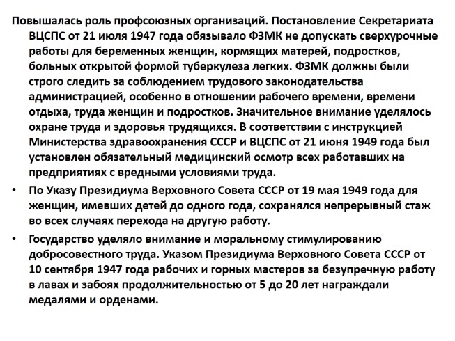 Повышалась роль профсоюзных организаций. Постановление Секретариата ВЦСПС от 21 июля 1947 года обязывало ФЗМК не допускать сверхурочные работы для беременных женщин, кормящих матерей, подростков, больных открытой формой туберкулеза легких. ФЗМК должны были строго следить за соблюдением трудового законодательства администрацией, особенно в отношении рабочего времени, времени отдыха, труда женщин и подростков. Значительное внимание уделялось охране труда и здоровья трудящихся. В соответствии с инструкцией Министерства здравоохранения СССР и ВЦСПС от 21 июня 1949 года был установлен обязательный медицинский осмотр всех работавших на предприятиях с вредными условиями труда.