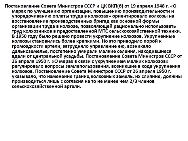 Постановление Совета Министров СССР и ЦК ВКП(б) от 19 апреля 1948 г. «О мерах по улучшению организации, повышению производительности и упорядочиванию оплаты труда в колхозах» ориентировало колхозы на восстановление производственных бригад как основной формы организации труда в колхозе, позволяющей рационально использовать труд колхозников в предоставленной МТС сельскохозяйственной техники. В 1950 году было решено провести укрупнение колхозов. Укрупненные колхозы становились более крепкими. Но это приводило порой к громоздкости артели, затрудняло управление ею, возникало дальноземелье, постепенно умирали мелкие селения, находившиеся вдали от центральной усадьбы. Постановление Совета Министров СССР от 26 апреля 1950 г. «О мерах в связи с укрупнением мелких колхозов» регулировало вопросы землепользования, возникшие в ходе укрупнения колхозов. Постановление Совета Министров СССР от 26 апреля 1950 г. указывало, что изменение границ колхозных земель, их слияние, должны производиться лишь с согласия на то не менее чем 2/3 членов сельскохозяйственной артели.