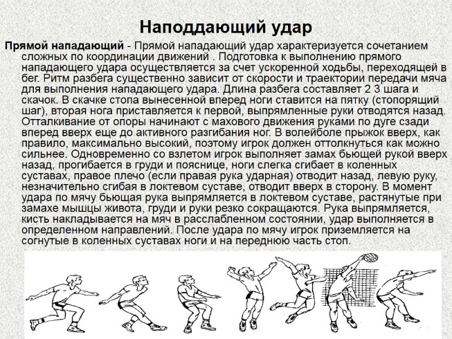 Прямой нападающий - Прямой нападающий удар характеризуется сочетанием сложных по координации движений . Подготовка к выполнению прямого нападающего удара осуществляется за счет ускоренной ходьбы, переходящей в бег. Ритм разбега существенно зависит от скорости и траектории передачи мяча для выполнения нападающего удара. Длина разбега составляет 2 3 шага и скачок. В скачке стопа вынесенной вперед ноги ставится на пятку (стопорящий шаг), вторая нога приставляется к первой, выпрямленные руки отводятся назад. Отталкивание от опоры начинают с махового движения руками по дуге сзади вперед вверх еще до активного разгибания ног. В волейболе прыжок вверх, как правило, максимально высокий, поэтому игрок должен оттолкнуться как можно сильнее. Одновременно со взлетом игрок выполняет замах бьющей рукой вверх назад, прогибается в груди и пояснице, ноги слегка сгибает в коленных суставах, правое плечо (если правая рука ударная) отводит назад, левую руку, незначительно сгибая в локтевом суставе, отводит вверх в сторону. В момент удара по мячу бьющая рука выпрямляется в локтевом суставе, растянутые при замахе мышцы живота, груди и руки резко сокращаются. Рука выпрямляется, кисть накладывается на мяч в расслабленном состоянии, удар выполняется в определенном направлений. После удара по мячу игрок приземляется на согнутые в коленных суставах ноги и на переднюю часть стоп.