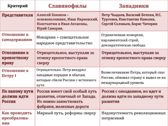 Представители Алексей Хомяков – основоположник, Иван Киреевский, Константин и Иван Аксаковы, Юрий Самарин. Петр Чаадаев, Василий Боткин, И.С. Тургенев, Константин Кавелин, Сергей Соловьев, Борис Чичерин