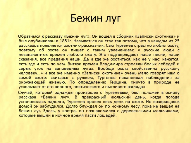 Обратимся к рассказу «Бежин луг». Он вошел в сборник «Записки охотника» и был опубликован в 1851г. Называться он стал так потому, что в каждом из 25 рассказов появляется охотник-рассказчик. Сам Тургенев страстно любил охоту, поэтому об охоте он пишет с таким увлечением: «…русские люди с незапамятных времен любили охоту. Это подтверждают наши песни, наши сказания, все предания наши. Да и где же охотиться, как не у нас: кажется, есть где и есть по чем. Витязи времен Владимира стреляли белых лебедей и серых уток на заповедных лугах. Вообще охота свойственна русскому человеку…» и все же именно «Записки охотника» очень мало говорят нам о самой охоте: скитаясь с ружьем, Тургенев накапливал наблюдения за окружающей жизнью. По определению Герцина, «ничто в природе не ускользает от его верного, поэтического и пытливого взгляда».
