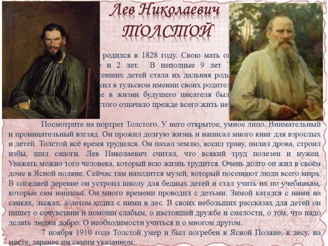 Посмотрите на портрет Толстого. У него открытое, умное лицо. Внимательный и проницательный взгляд. Он прожил долгую жизнь и написал много книг для взрослых и детей. Толстой всё время трудился. Он пахал землю, косил траву, пилил дрова, строил избы, шил сапоги. Лев Николаевич считал, что всякий труд полезен и нужен. Уважать можно того человека, который всю жизнь трудится. Очень долго он жил в своём доме в Ясной поляне. Сейчас там находится музей, который посещают люди всего мира. В соседней деревне он устроил школу для бедных детей и стал учить их по учебникам, которые сам написал. Он много времени проводил с детьми. Зимой катался с ними на санках, лыжах, а летом ходил с ними в лес. В своих небольших рассказах для детей он пишет о сочувствии и помощи слабым, о настоящей дружбе и смелости, о том, что надо делать людям добро. О необходимости учиться и о многом другом.